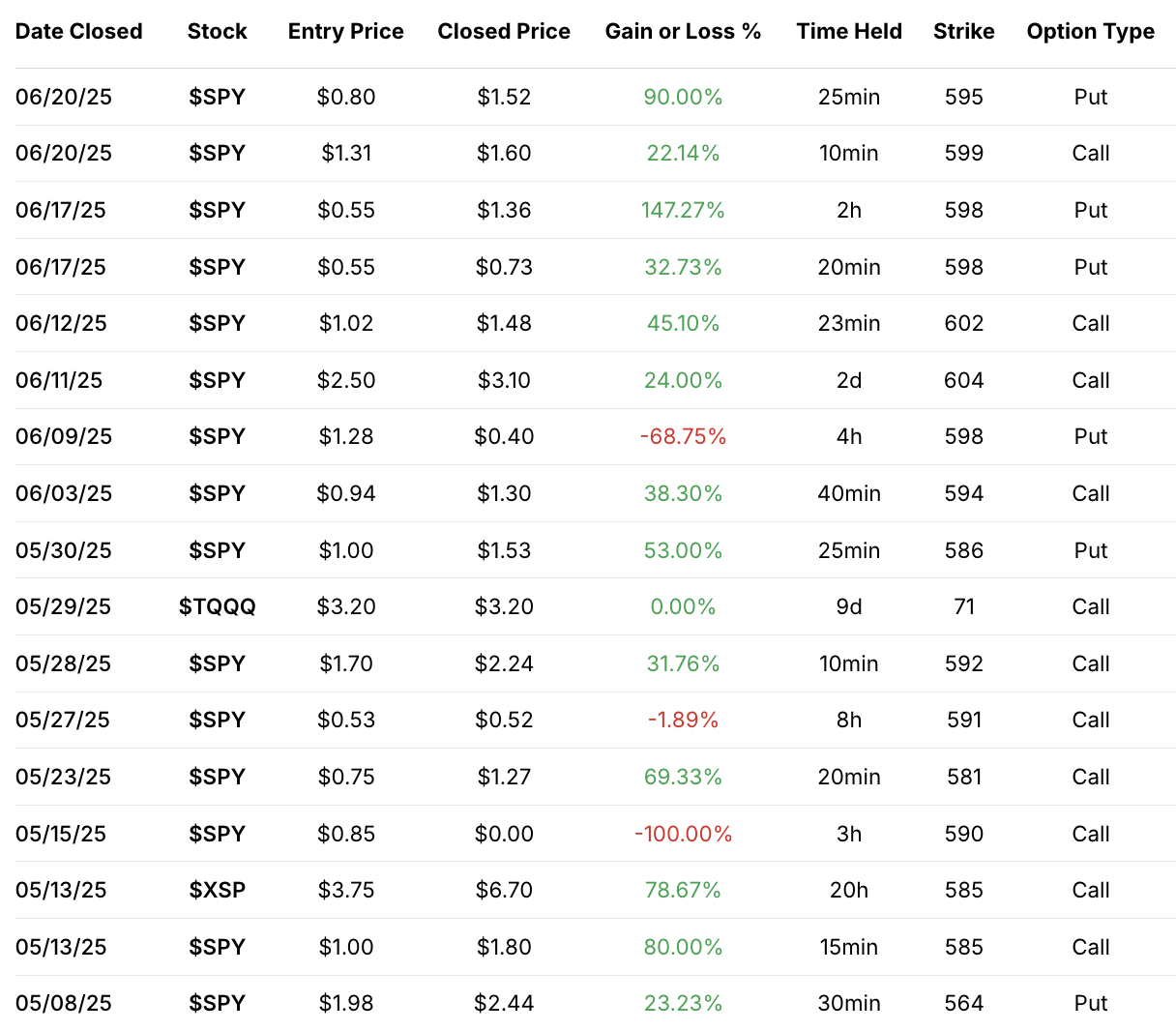 Since her last event on May 7, Olivia has closed 13 trades, navigating a volatile market shaped by FOMC meetings, Iran war tensions, and tech sector swings—don’t miss your chance to catch up!